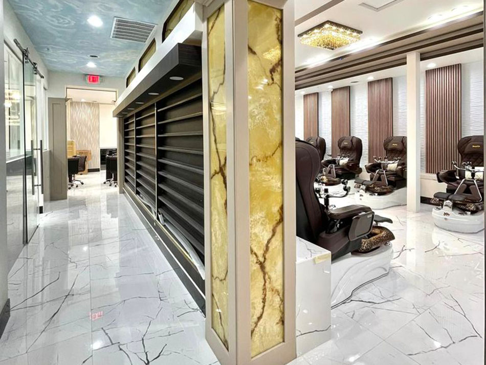 wall, ceiling, lightbox, bar counter, reception desk, columns, and other interior designs.